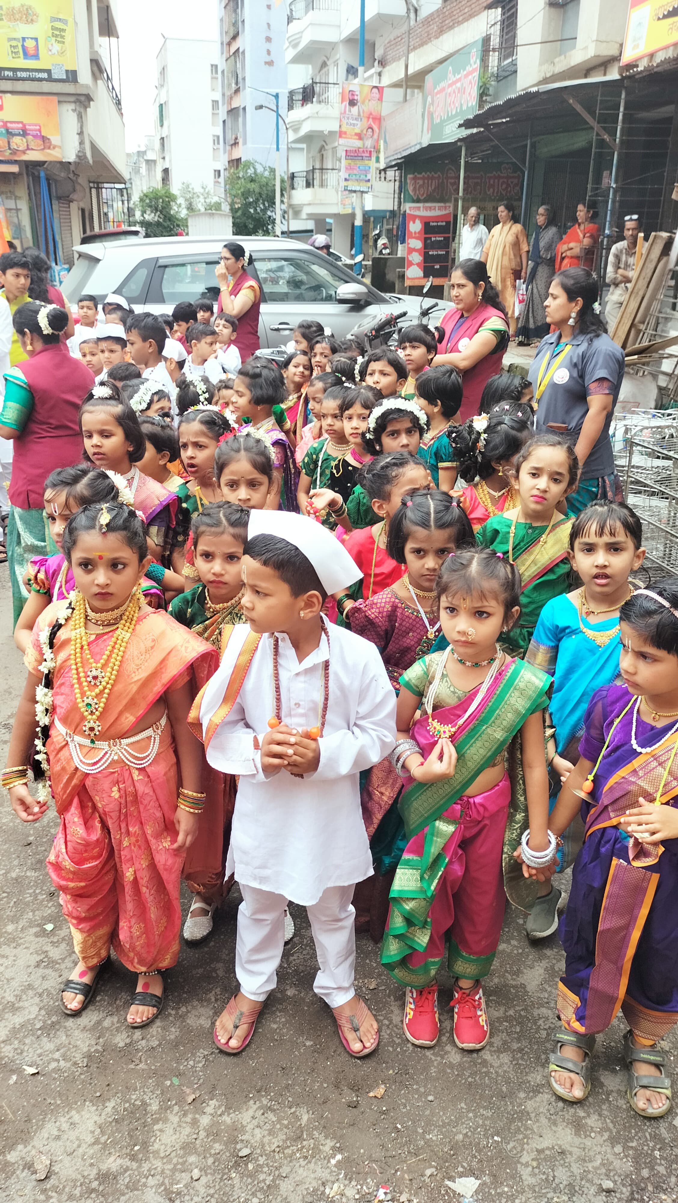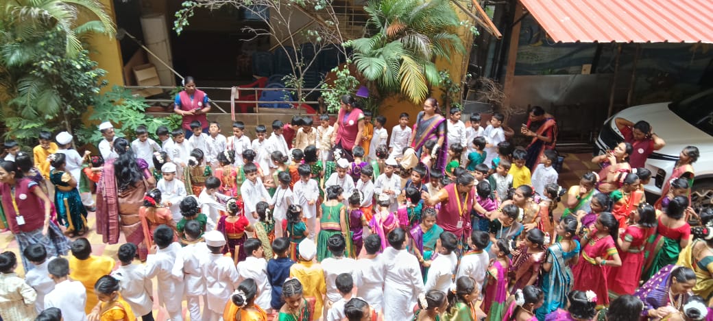 Traditional Attire : The school campus came alive with vibrant Maharashtrian clothing—pheta, nauvari sarees, and green costumes symbolizing the lush Aashadh month.